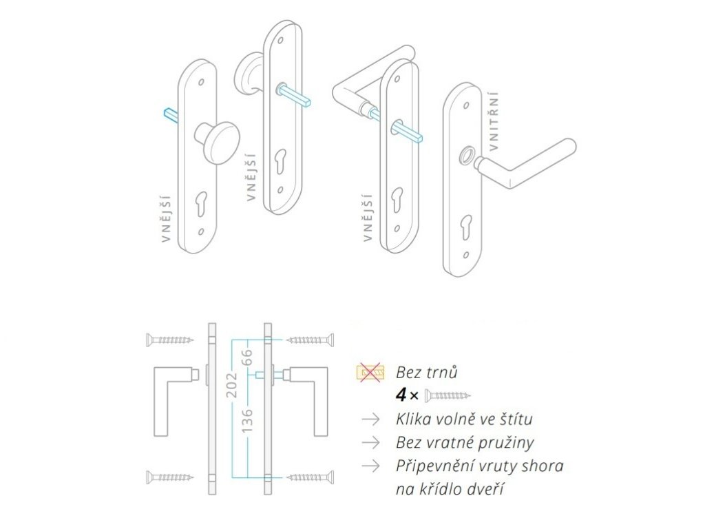 Klika je volně ve štítu bez vratné pružiny. Bez trnů proti proti pootočení. Připevnění vruty shora na křídlo dveří.