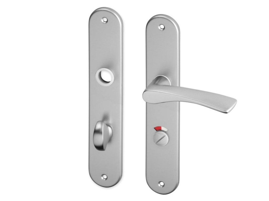 Klika je volně ve štítu bez vratné pružiny. Bez trnů proti pootočení. Štíty jsou přišroubovány vruty shora na dveře.