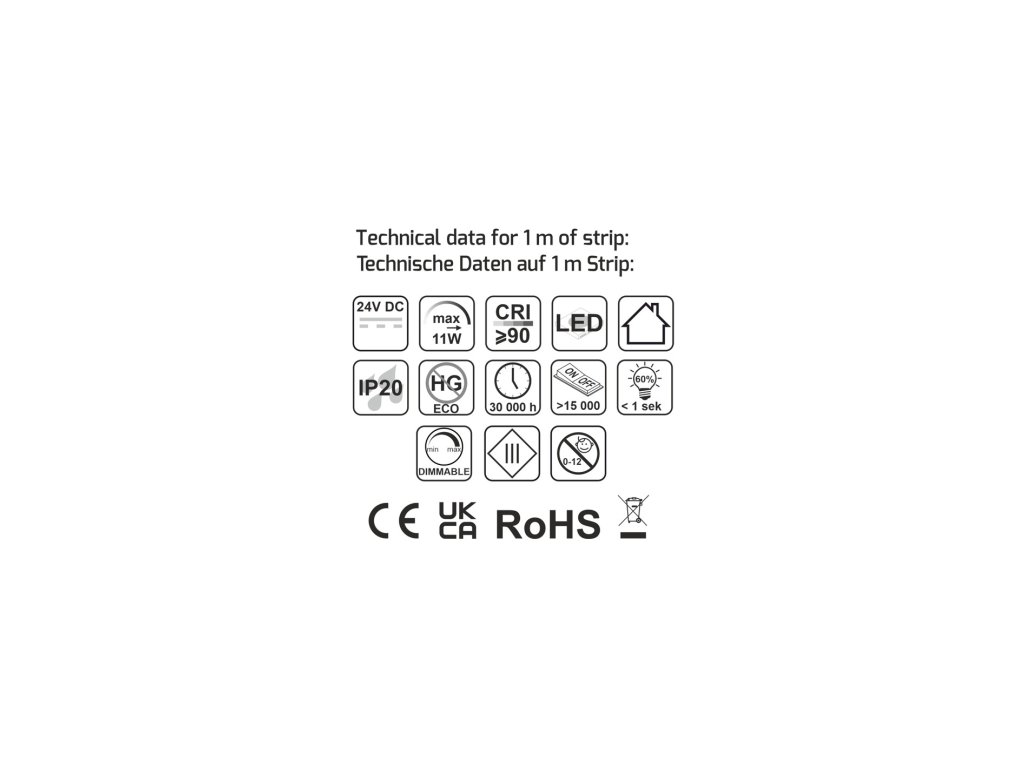 Výkonově se hodí jak pro přímé nasvícení (pod linku, do vitrín), tak pro nepřímé ambientní světlo (podhledy, niky, police). Napájení 24 V DC zajišťuje stabilní chod a menší úbytky napětí na delších úsecích.