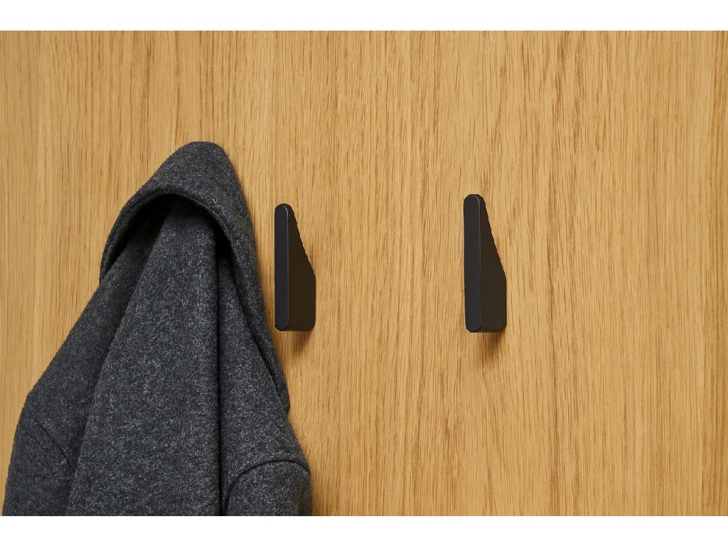 Moderní nábytkový věšák s trendy černou povrchovou úpravou, rozhodně zaujme svým čistým designem. Díky masivnímu tělu nábytkového věšáku, je vhodný i na těžší kabáty apod. Skvěle se hodí na bílé/světlé barvy nábytku. Na dřevo dekorech skvěle vypadá v kombinaci s dubem nebo jasanem. Ovšem padne i na další typy dřevin.