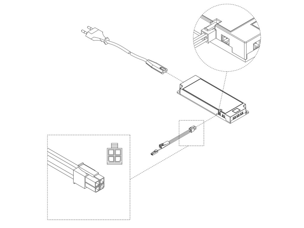 Zdroj je vybaven čtyřmi nebo šesti výstupními porty typu MINILED - dle výkonostní varianty, ke kterým lze připojit LED svítidla bez nutnosti pájení či dalších adaptérů. Součástí převodníku je také speciální SMART port, který umožňuje jednoduché připojení senzorů a bezdotykových ovládacích modulů typu Plug & Play – ideální pro moderní a pohodlné ovládání osvětlení. V balení naleznete montážní příslušenství a propojovací kabely.