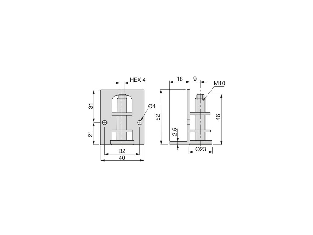Nožka má průměr 23 mm a je vybavena kovovým úhelníkem, který se snadno upevní do nábytkové konstrukce. Kombinace kvalitních materiálů zajišťuje dostatečnou nosnost a dlouhou životnost, zatímco černá plastová krytka chrání podlahu před poškozením.