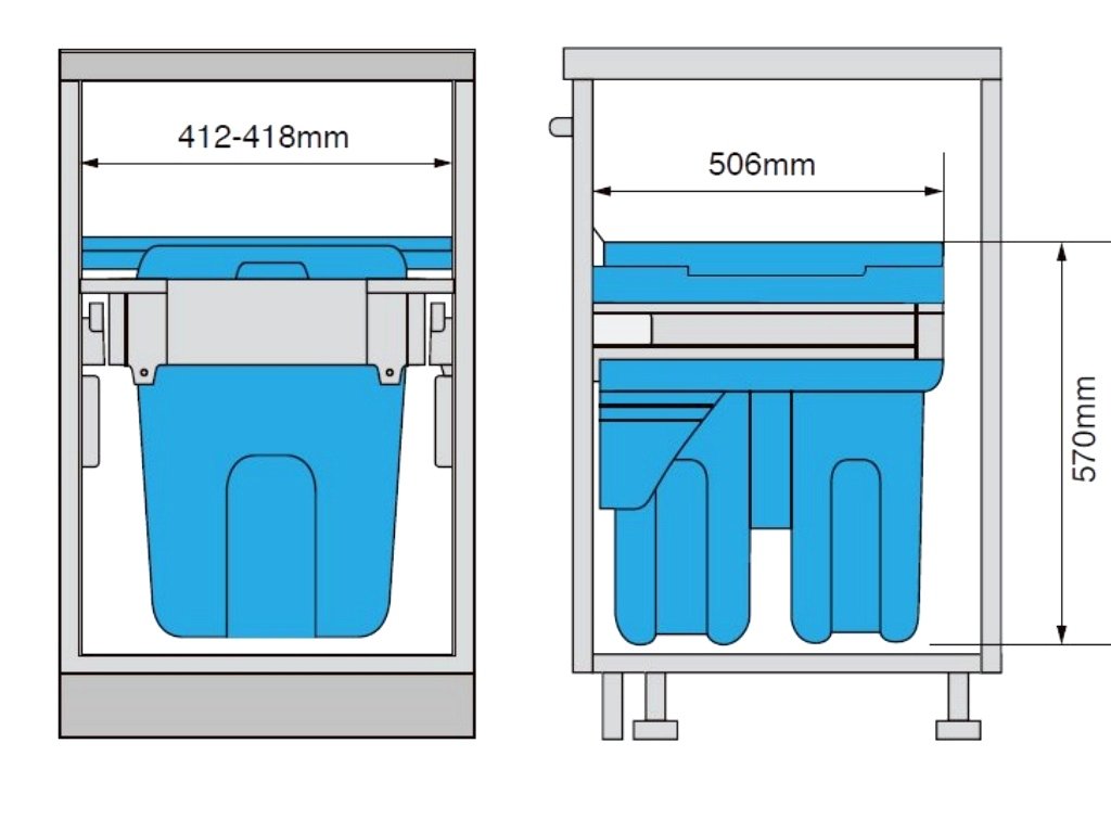 Koš je určen pro skříňky o vnější šířce 450 mm (min. vnitřní rozměry 412 - 418 mm). Na výšku je potřeba min 570 mm a hloubku skříňky min 506 mm. Viz technický nákres v obrázcích.