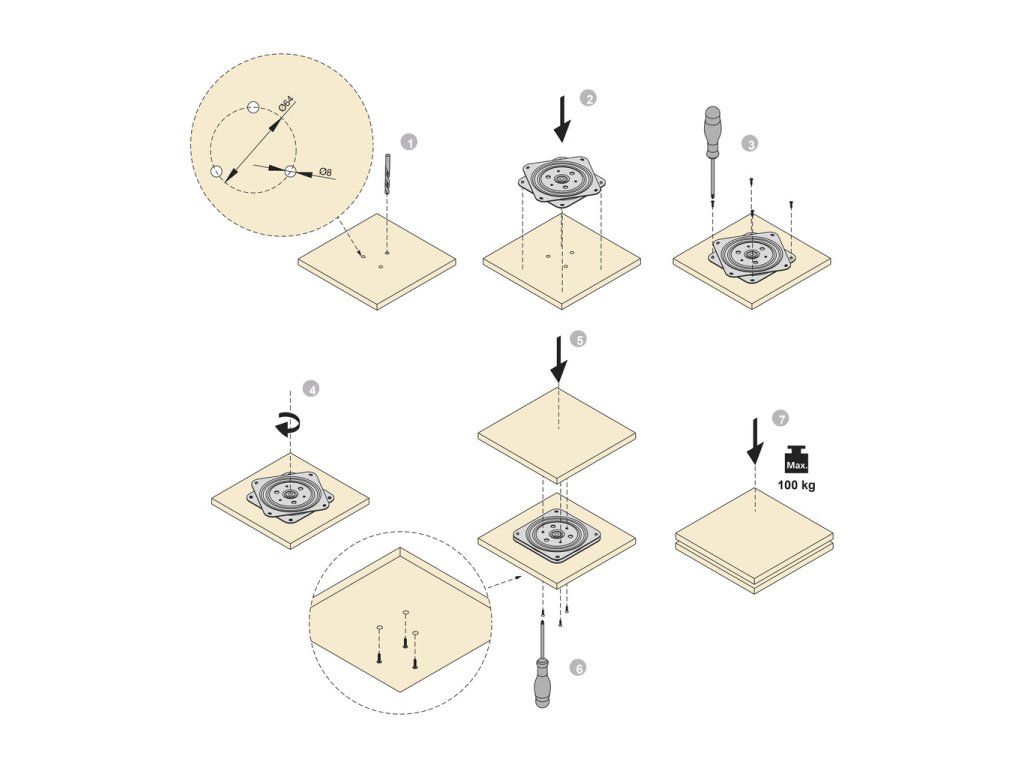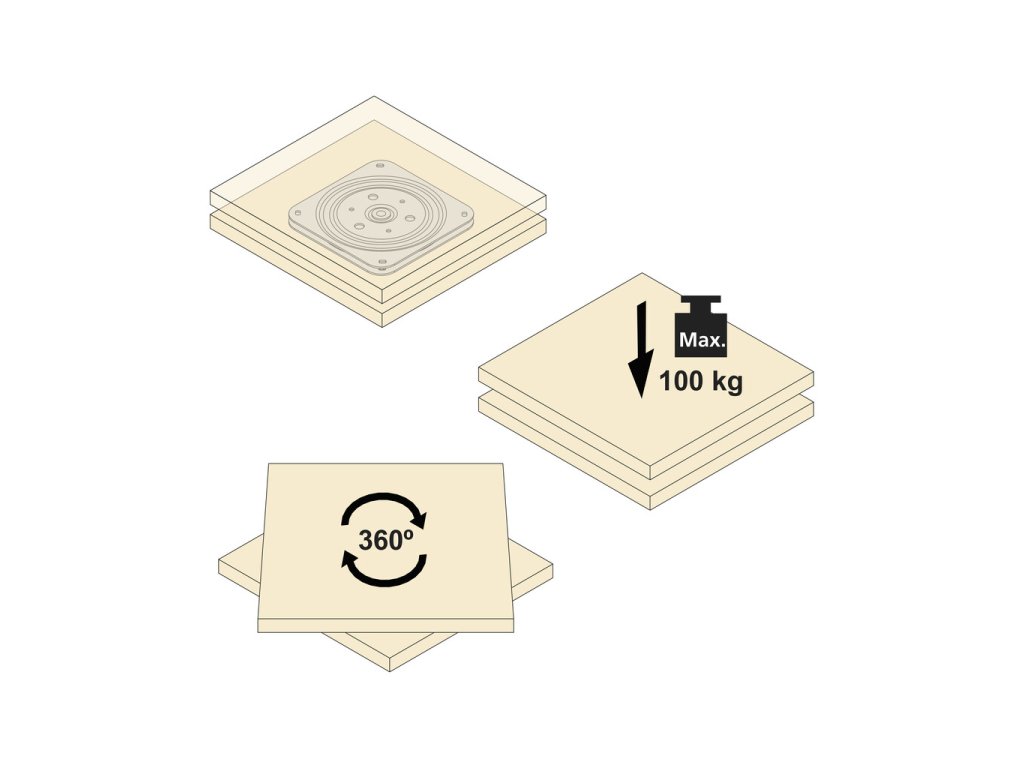 Velká nosnost až 100 kg umožňuje použití pro různé těžké předměty – od televizí a monitorů, přes otočné stoličky, až po prezentační stojany nebo otočné kuchyňské platformy. Montáž je snadná: stačí přišroubovat základnu pomocí standardních vrutů do dřeva (nejsou součástí balení).