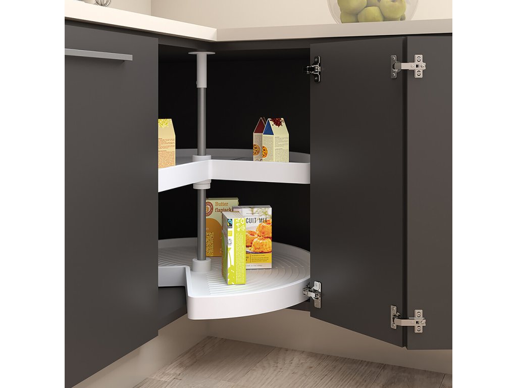 Pár otočných polic Shelvo 3/4 promění roh vaší kuchyňské skříňky o šířce 90 cm v přehledný a snadno přístupný úložný prostor. Díky ergonomickému designu můžete celý obsah pohodlně vytáhnout do prostoru, aniž byste se museli ohýbat nebo sahat do hloubky rohu.