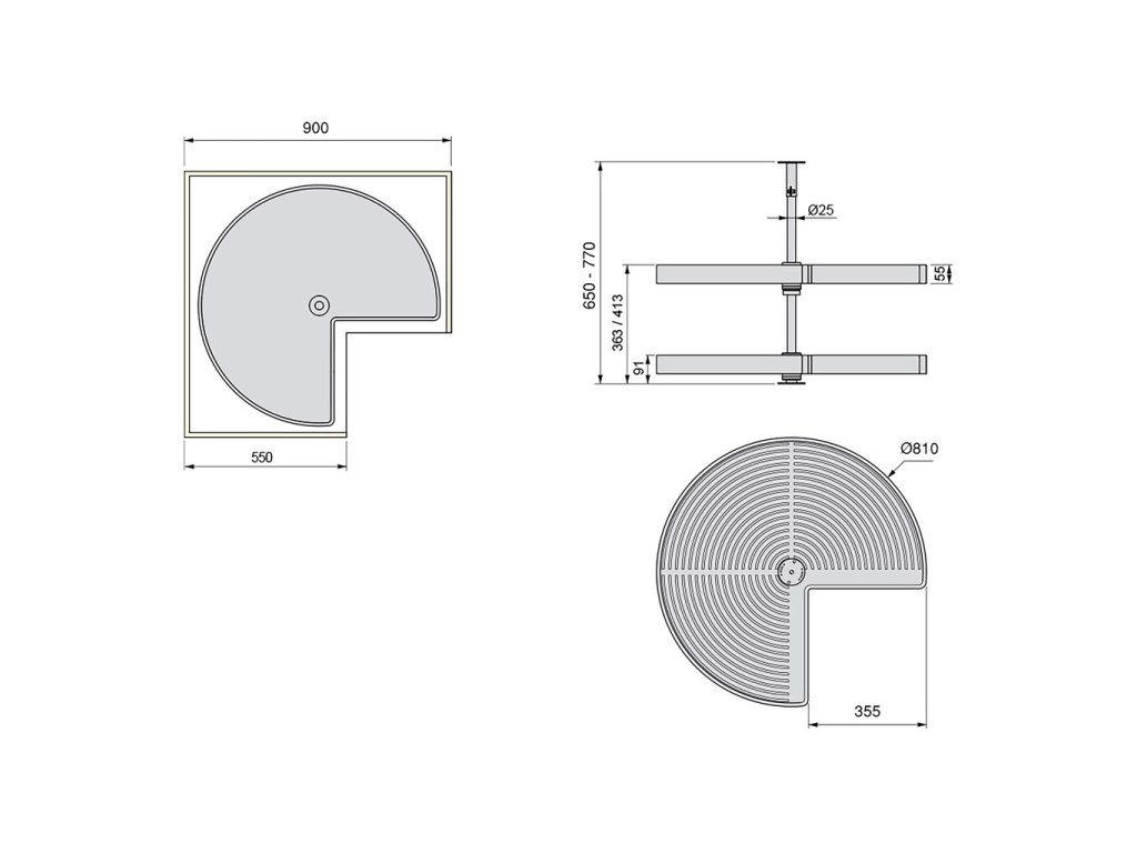 Police o průměru 810 mm jsou vyrobeny z šedého plastu – odolného vůči nárazu, vlhkosti. Centrální hliníková tyč s matnou anodizací umožňuje montáž ve výškách mezi 650 a 770 mm, bez nářadí a s dorazovým zarážkou pro bezpečné vysunutí. Každá police unese až 20 kg rovnoměrně rozloženého zatížení.