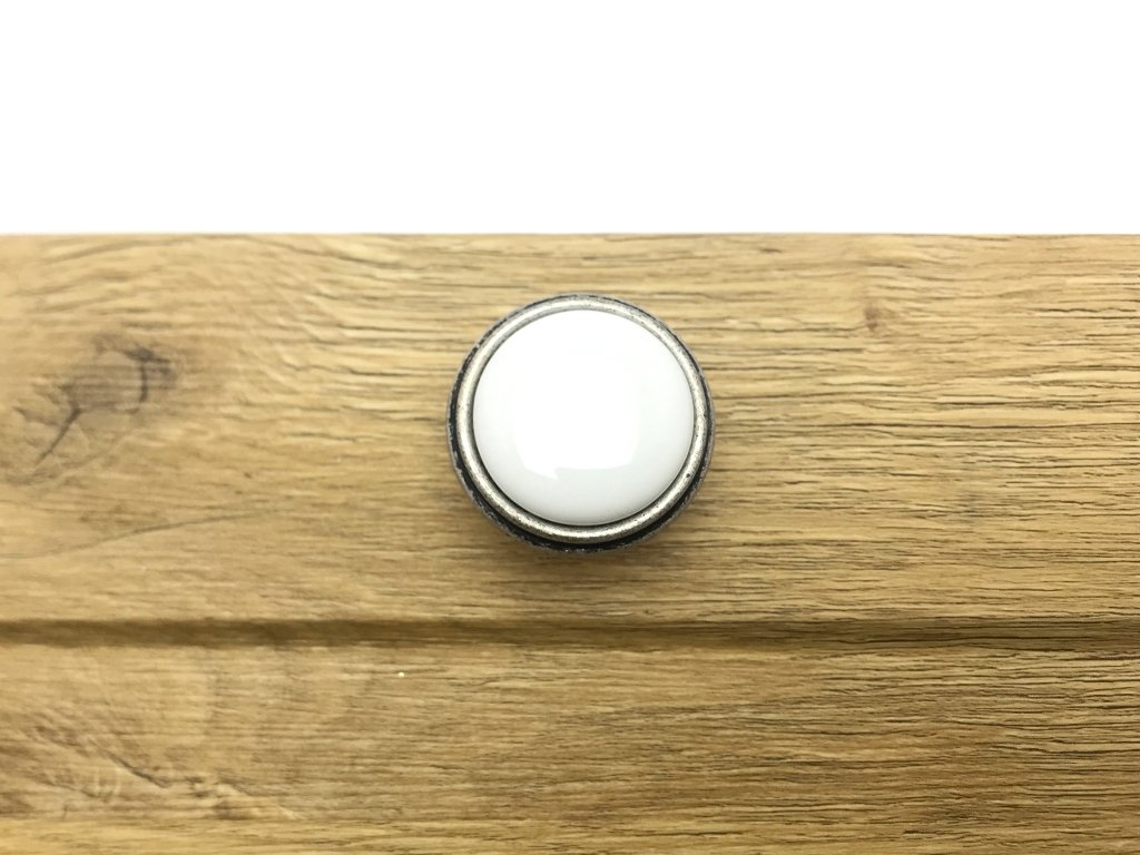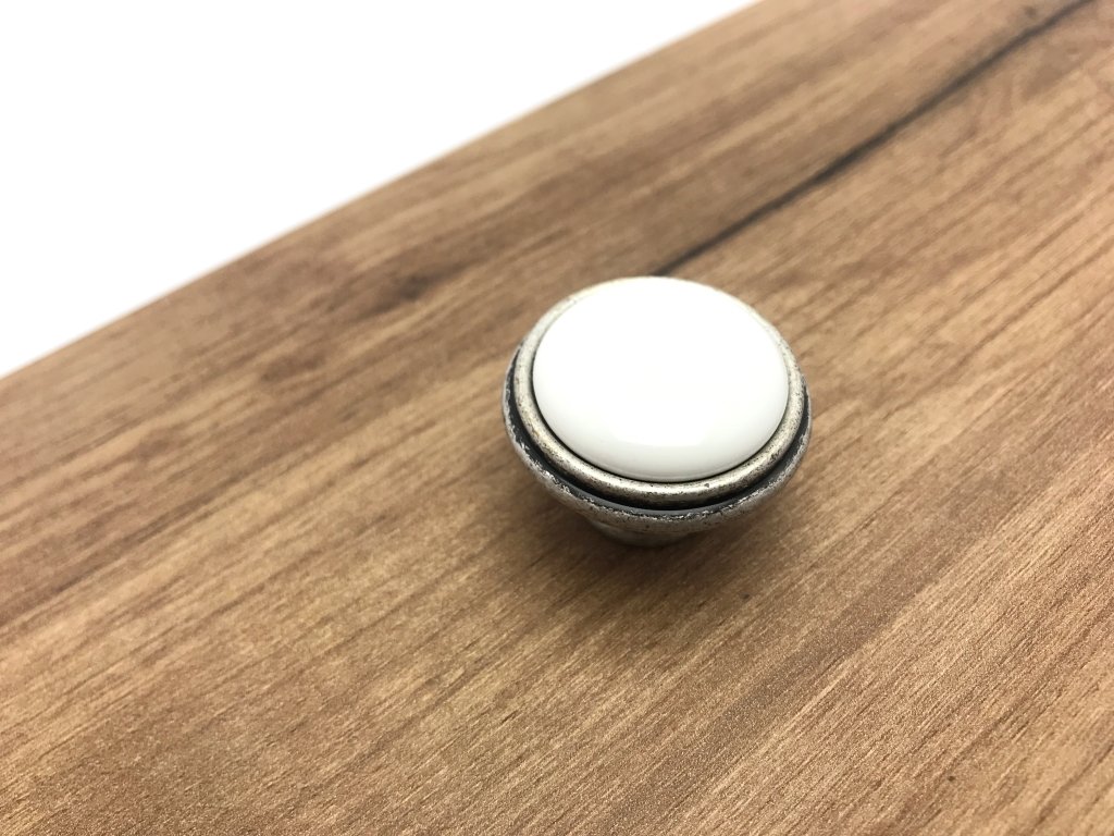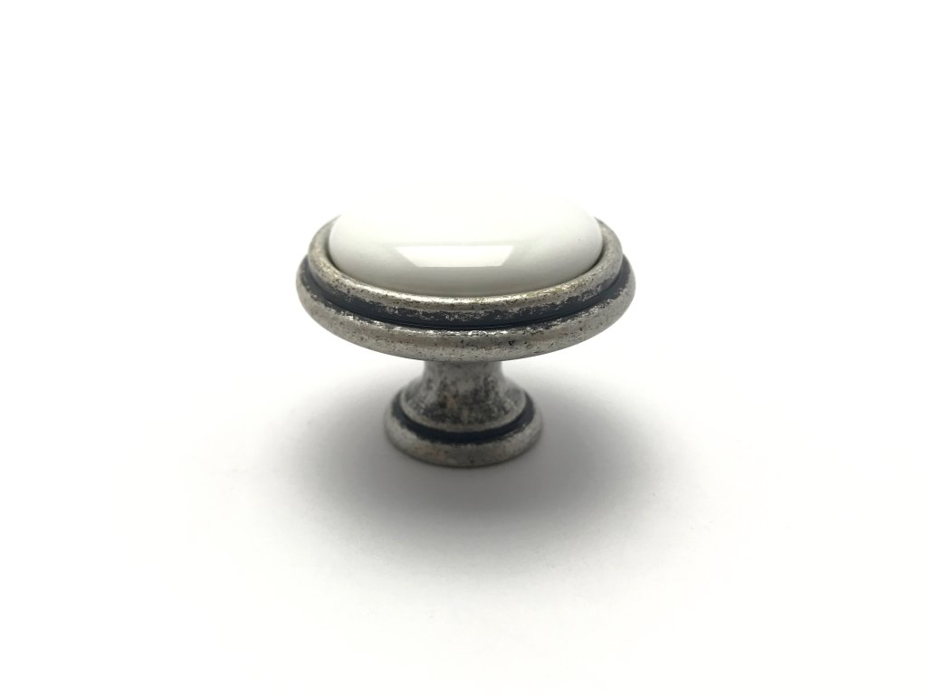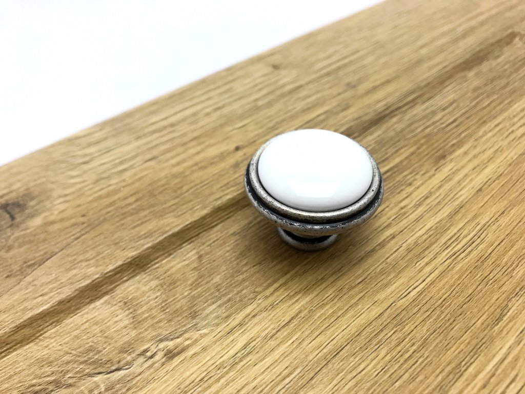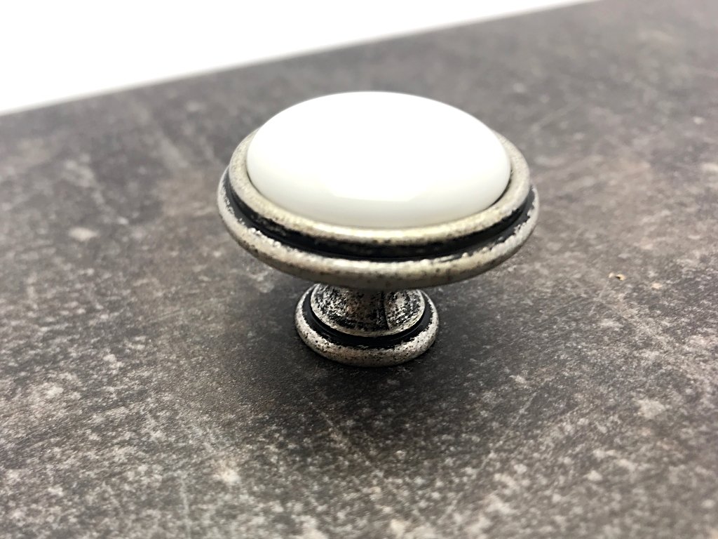 Porcelánová knopka ve spojení s kovovou základnou v povrchové úpravě starostříbro. Knopka se svým vzhledem řadí do retro knopek. Knopka se hodí do rustikálního interiéru nebo pro renovaci staršího nábytku. Jednoduchý desing knopek a úchytky Margarita dokáže dotvořit ten správný vzhled nábytku v rustikálním stylu.