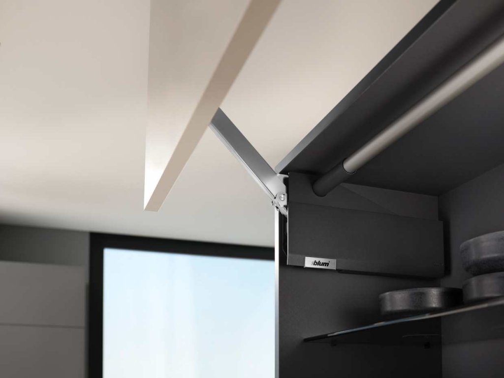 Výklop AVENTOS HL top je elegantní a technicky vyspělé řešení pro horní skříňky, kde se dvířka zvedají paralelně s čelem korpusu. Dvířka se otevírají hladce a zůstávají v libovolné poloze. Díky kompaktním rozměrům je vhodný i pro menší korpusy.