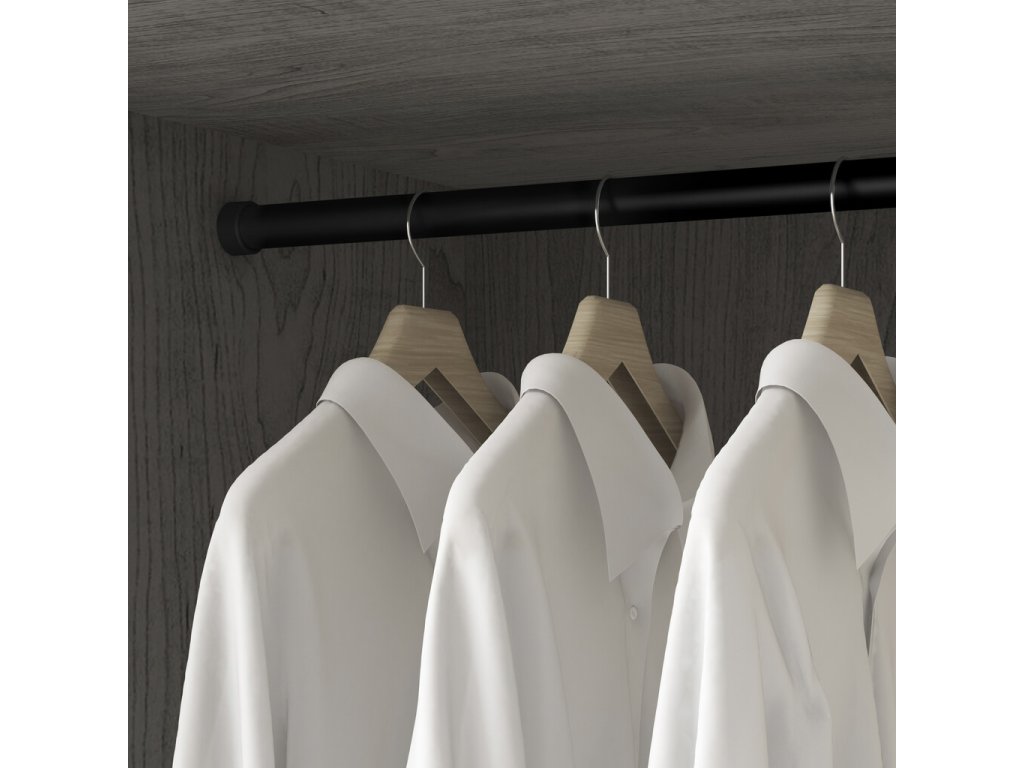 Instalace je intuitivní – tyč stačí zasunout do držáků a upevnit. Moka povrch ladí s moderními dřevěnými a laminátovými dekory a jemně zaoblený profil zaručuje bezpečné zavěšení ramínek bez poškození.