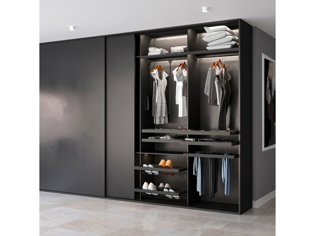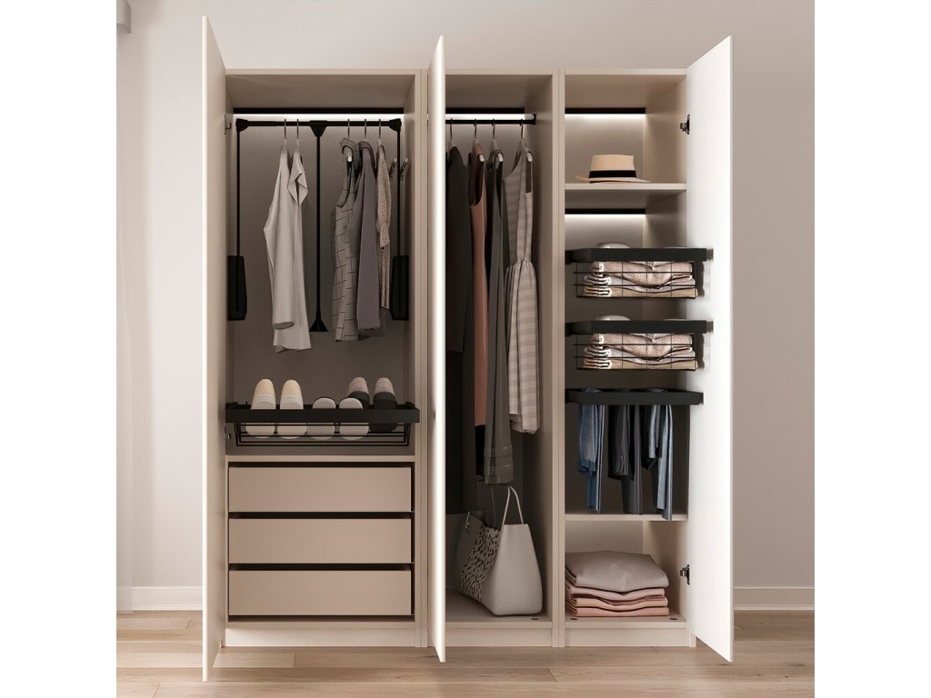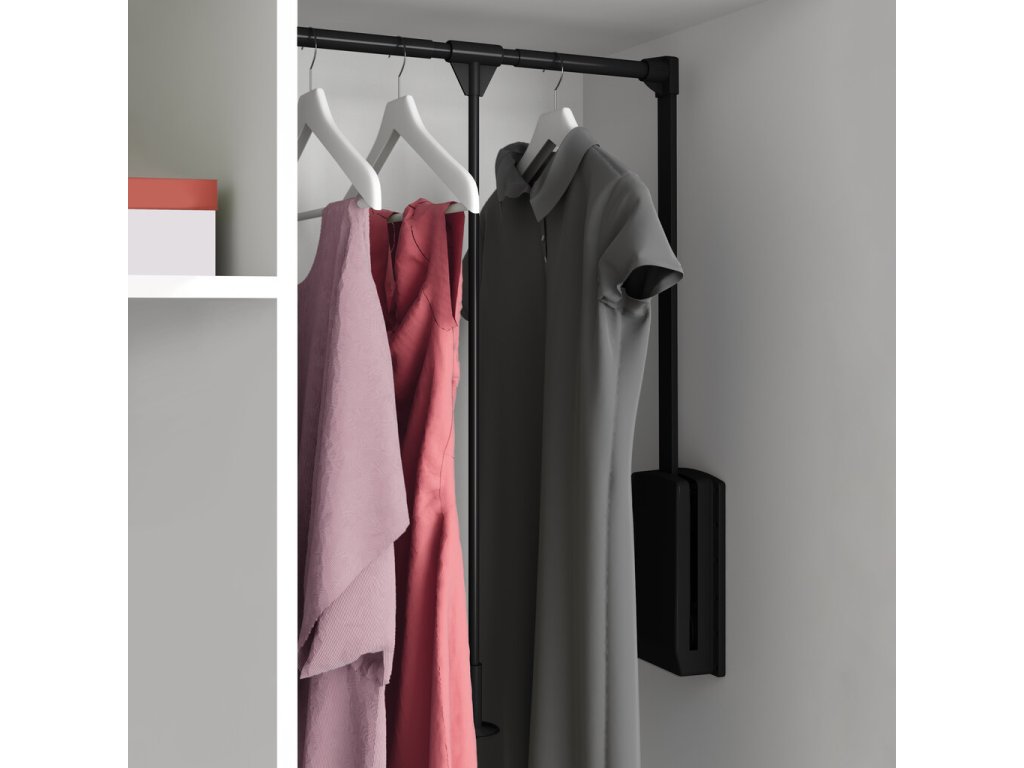 Sklopná šatní tyč ZERO umožňuje pohodlné využití horní části šatní skříně bez nutnosti použití schůdků. Mechanismus umožňuje snadné stažení tyče do dosahu a její bezpečné vrácení zpět do horní polohy. Díky stabilní konstrukci je vhodná pro každodenní používání a běžné zatížení oděvy na ramínkách. Elegantní provedení se hodí do moderních vestavných skříní i otevřených šaten.