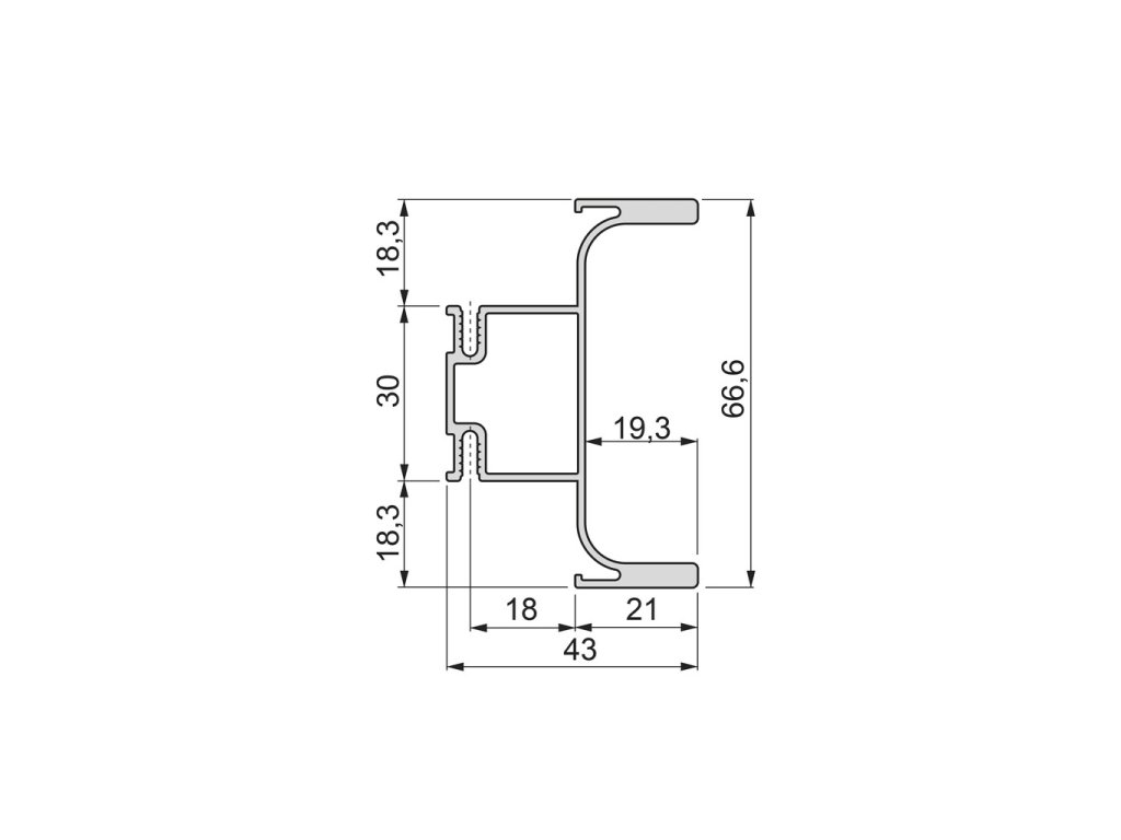 Profil je z kvalitního hliníku, dodáván v délce 2 550 mm a je snadno zkratitelný dle konkrétní potřeby instalace. Montáž je jednoduchá — postačí přichycení pomocí vrutů (doporučeno 3,5 × 25 mm) a použití distančních podložek pro správné usazení zadní části korpusu. Viditelné plochy profilu jsou chráněné fólií, která zabraňuje poškrábání během práce.