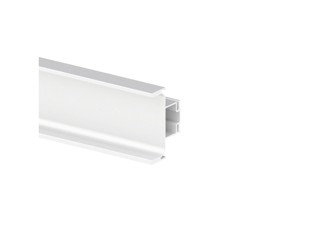 Profil je z kvalitního hliníku, dodáván v délce 2 550 mm a je snadno zkratitelný dle konkrétní potřeby instalace. Montáž je jednoduchá — postačí přichycení pomocí vrutů (doporučeno 3,5 × 25 mm) a použití distančních podložek pro správné usazení zadní části korpusu. Viditelné plochy profilu jsou chráněné fólií, která zabraňuje poškrábání během práce.