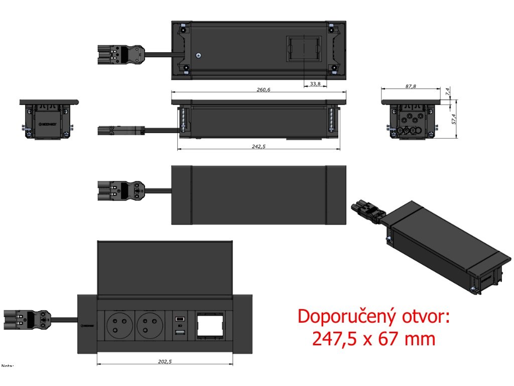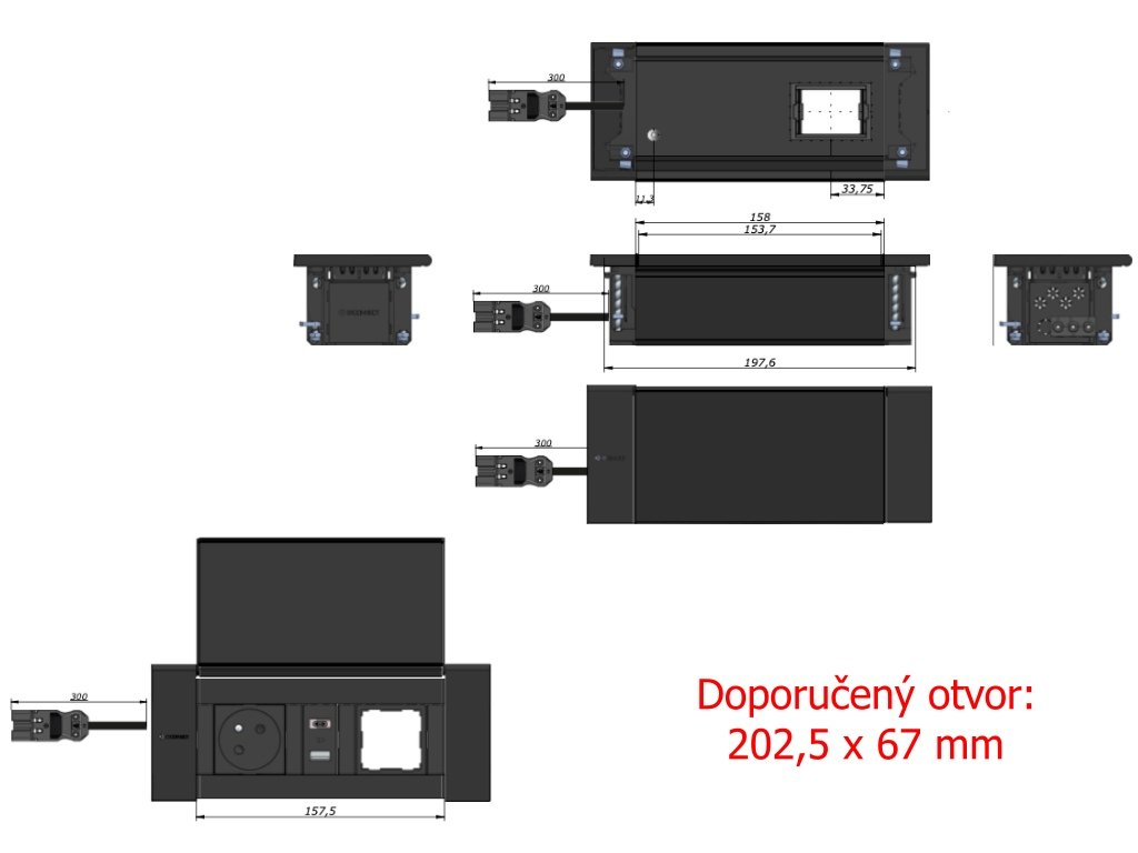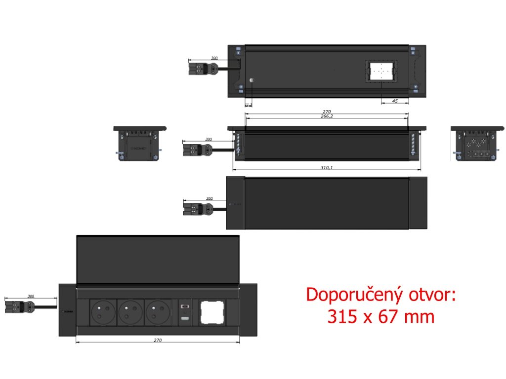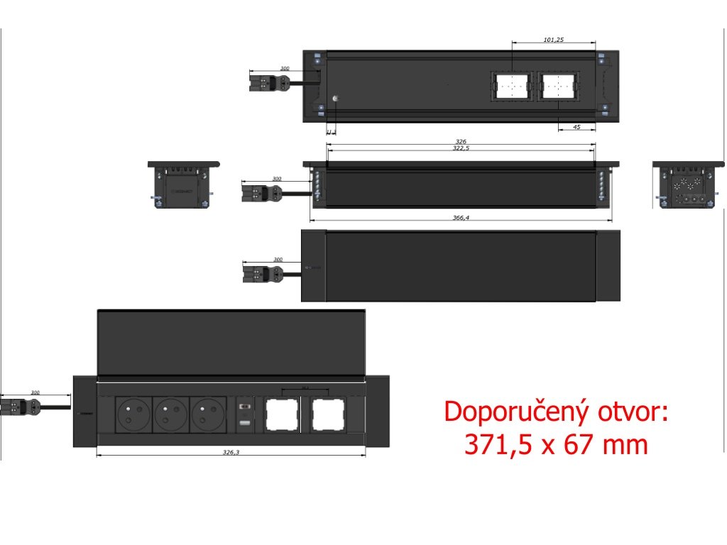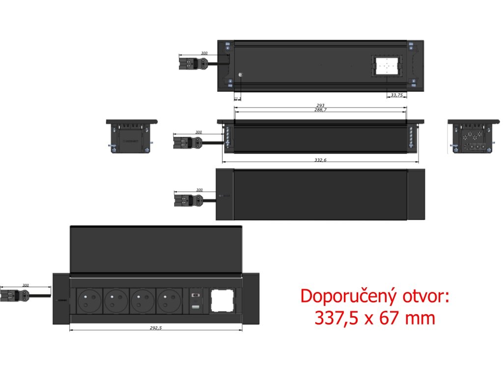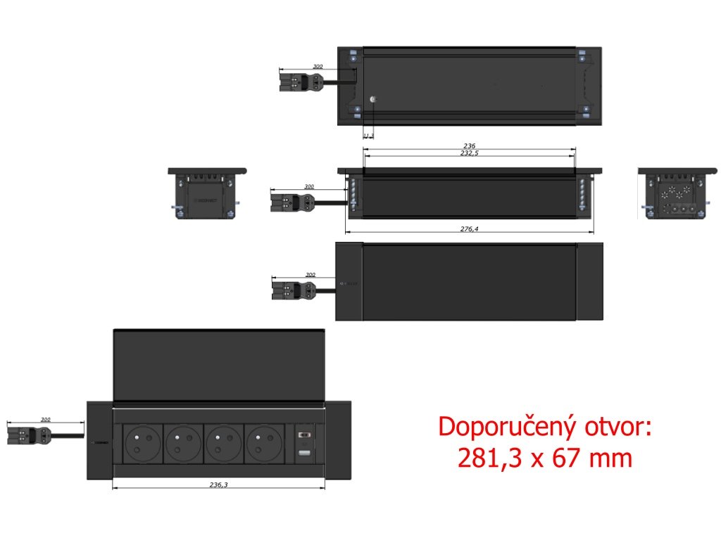 | Typologie el. zásuvky | Zásuvka s USB, Zásuvky s 230V, Zásuvka s 230V a další pozicí |