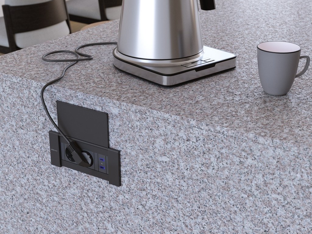 Vestavná elektro zásuvka NEXO je určená pro vestavnou montáž do pracovní desky, sádrokartonu, obkladu apod. Montáž se provádí z horní strany, po vysunutí bočních krytek do stran, pomocí inbusového klíče dotáhneme úhelníky se ze spodní strany k podkladu. Po utažení opět nasuneme boční krytky zpět. Zásuvka Nexo je určená pro montáž do materiálu o tloušťce 5 - 35 mm.
