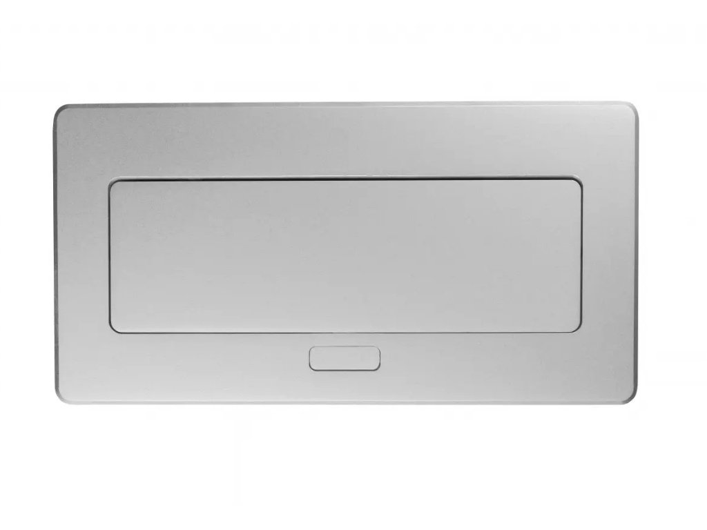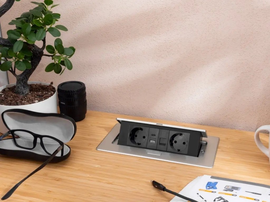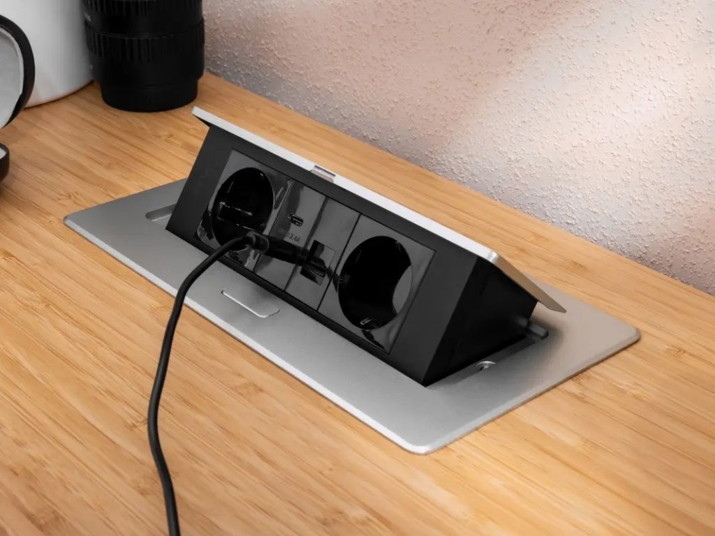 Zásuvka s moderním a ergonomickým designem pro instalaci do pracovního stolu nebo nábytku.