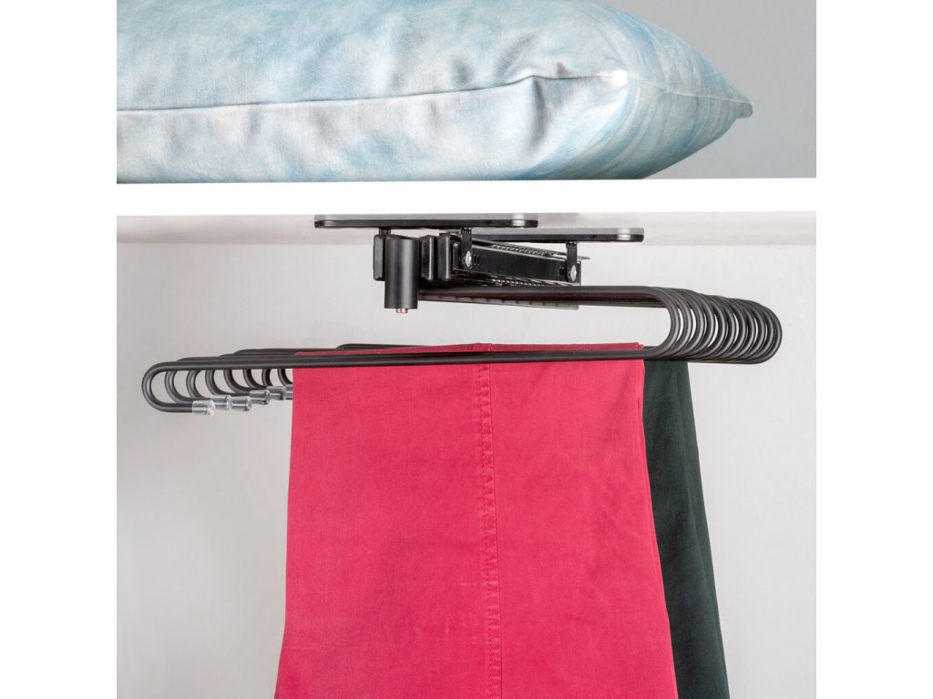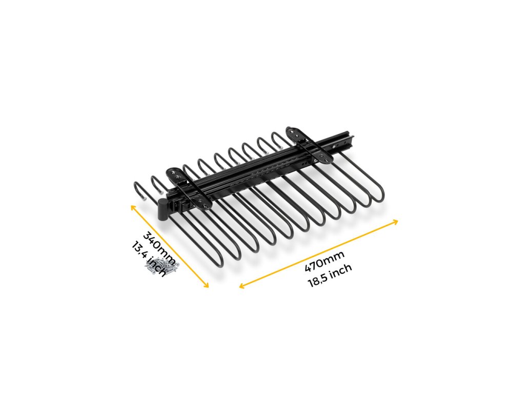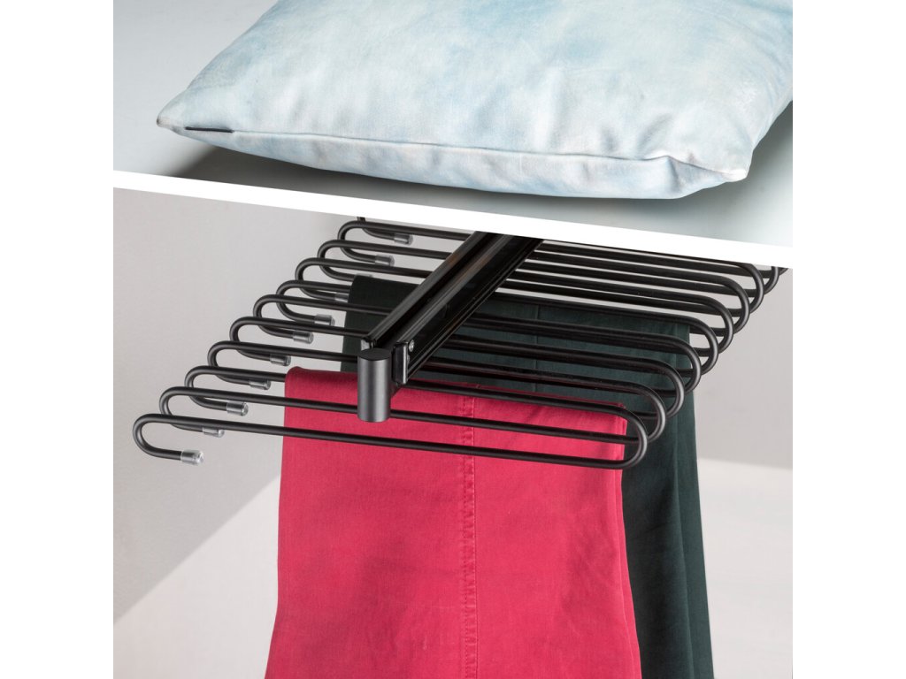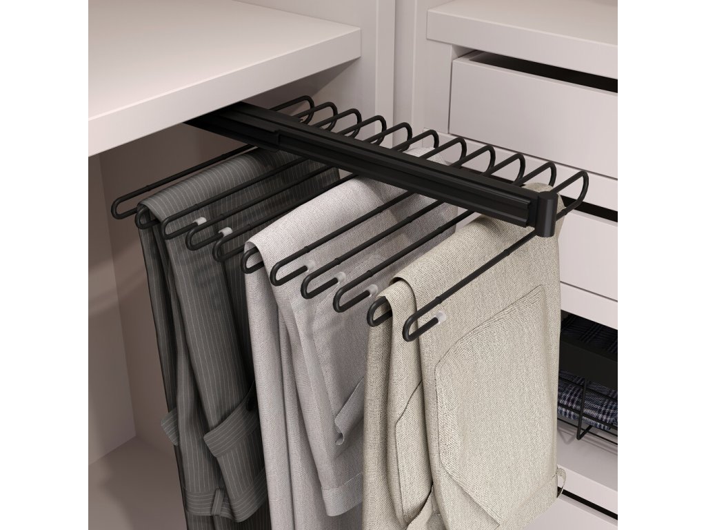 Vylepšete organizaci vaší šatní skříně elegantním vysouvacím držákem na kalhoty. Tento model nabízí 11 tyčí, které umožňují krásné rozložení jednotlivých kusů bez vzájemného přehýbání. Díky plnému výsuvu můžete snadno dosáhnout na kalhoty i v zadních polohách bez potřeby manipulace s předními kusy. Konstrukce je z odolné oceli s černým lakem, což zaručuje dlouhou životnost a decentní vzhled ladící s moderním interiérem.