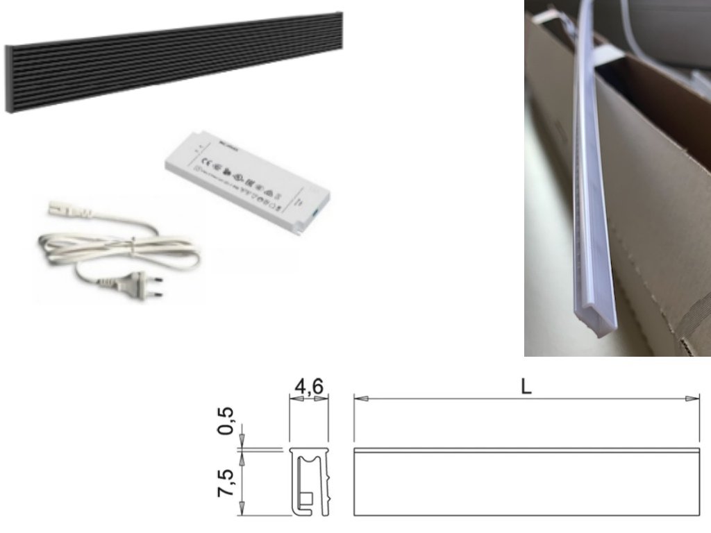 - Transformátor s vidlicí pro připojení do el. zásuvky - rozměr 256x34mm a výška 17mm.